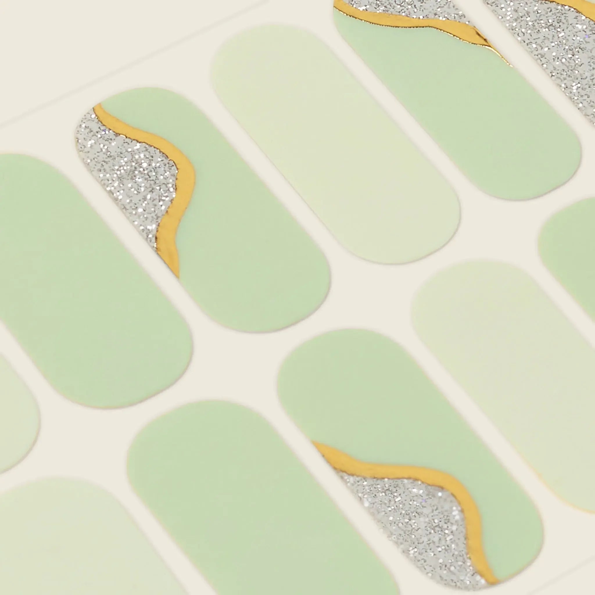 Kim brings a calm sage green base to life with silver glitter and gold detailing ā a chic mix of serenity and sparkle. Perfect for when you want understated elegance with a twist.